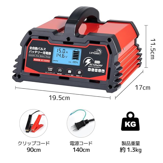 【JAF出動回避!】LVYUAN(リョクエン) 15A 全自動パルスバッテリー充電器 12V/24V鉛/12Vリン酸鉄バッテリー両用|全自動 スマートチャージャー|PSE認証| サルフェーション除去(脱硫) バッテリー診断機能付 「パルス充電」バッテリー復活|AGM/GEL/LiFePO4対応|車・農機・船舶用