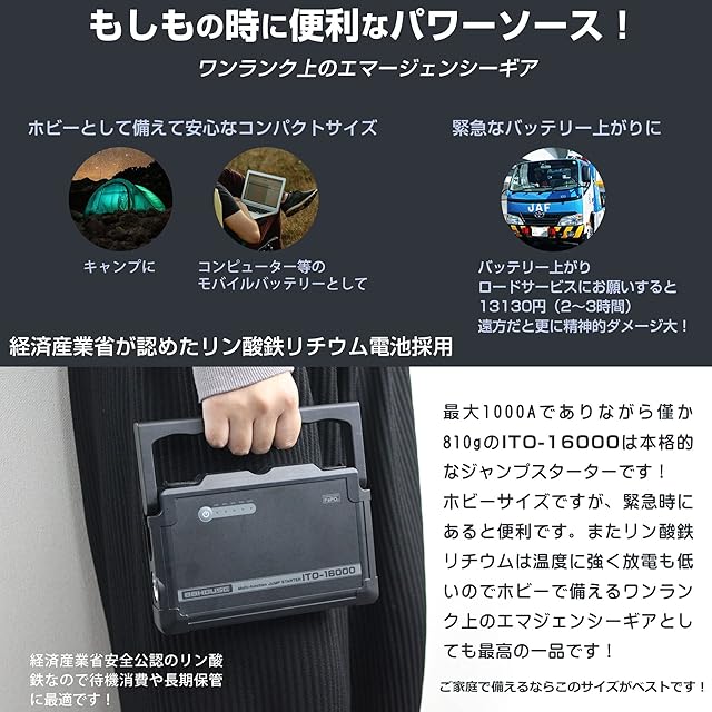 商品名:ハチハチハウス ジャンプスターター ITO-16000 安全な リン酸鉄 リチウム電池 LiFePO4 12V 大容量 16000mAh ガソリン/ディーゼル車対応 最大電流 1000A 安全保護機能 コンパクト 800グラム L1620F
