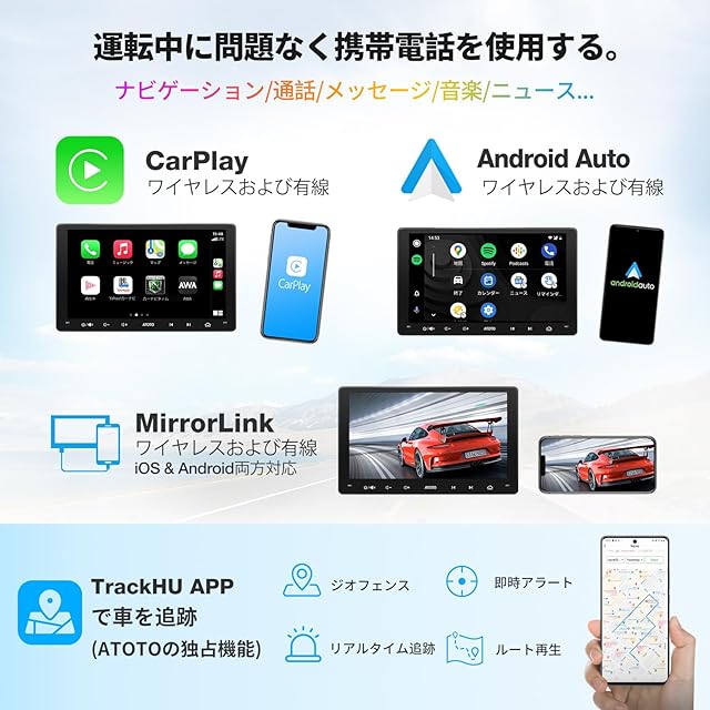 【ワイヤレスCarPlay、Android Auto、MirrorLink】ワイヤレスのCarPlay/Android Autoを使用すれば、車に乗るたびにiPhone/Android携帯を接続する必要はありません。BluetoothとWi-Fi経由でワイヤレスで一度接続すると、次回からは自動的になります。CarPlay/Android Autoのオンラインマップを使用するか、A6 PFの内蔵GPSを使用してオフラインでの方向を取得してください。CarPlayやAndroid Autoと互換性のないほとんどのアプリは、MirrorLinkを使用してA6 PFの画面にキャストできます。