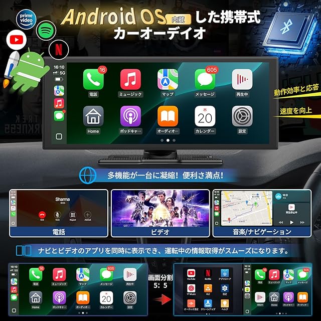 商品名:LAMTTO ディスプレイオーディオ10.25インチ Androidシステムを搭載 YouTubeやNetflixが見れる ワイヤレスCarPlay/Androidauto対応 1台多用 スマホ連携表示ナビ 駐車補助 2画面分割 内蔵スピーカー/WiFi/Bluetooth/Type-C/AUX入力/FM 二つ取付ホルダー 取り付け簡単