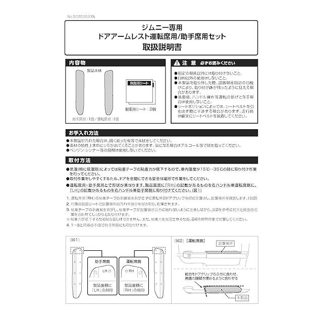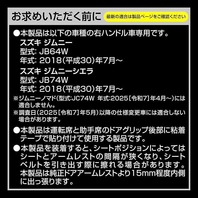 ●スズキ ジムニー(JB64W)、ジムニーシエラ(JB74W)専用開発のドアアームレスト本製品は、ジムニー(型式:JB64W 年式:2018[平成30]年7月~)/ジムニーシエラ(型式:JB74W 年式:2018[平成30]年7月~)の右ハンドル車専用に設計・デザインされたドアアームレストです。本製品は運転席と助手席のドアグリップ後部に粘着テープで貼り付けて装着する製品です。 ※本製品はジムニーノマド(5ドアモデル) (型式:JC74W 年式:2025(令和7)年4月~)には適合しません。