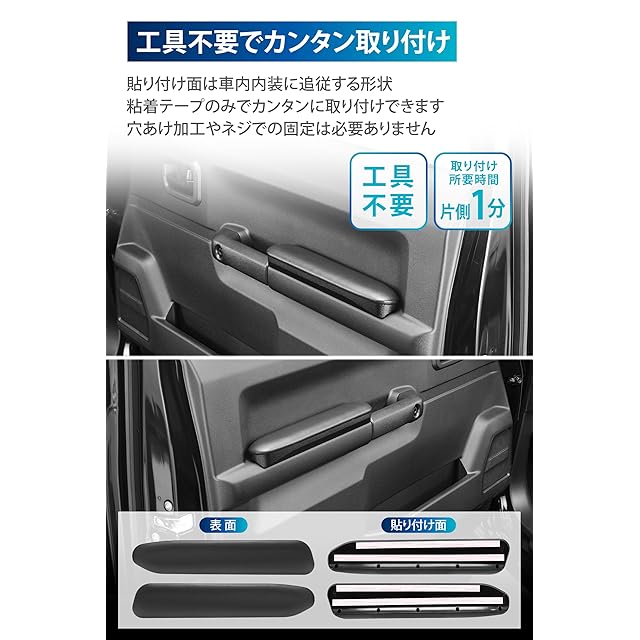 ●工具不要でカンタン取り付け(所要時間の目安:片側1分) 貼り付け面は車内内装に追従する形状で、粘着テープのみでカンタンに取り付けできます。 穴あけ加工やネジでの固定は必要ありません。