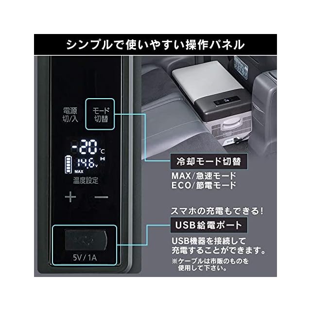 電源/交流:100V、50-60Hz(アダプター使用)、直流:12V/24V 消費電力:急速モード:45W、節電モード:30W 温度設定:-20~20℃