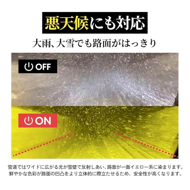 【悪天候にも対応】大雨、大雪でも路面がはっきり。雪道ではワイドに広がる光が雪壁で反射しあい、路面が一面イエロー系に染まります。鮮やかな色彩が路面の凹凸をより立体的に際立たせるため、安全性が高くなります。