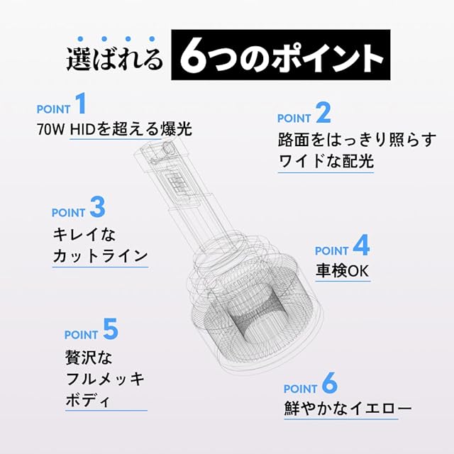 【選ばれる6つのポイント】①65W HIDを超える爆光②路面をはっきり照らすワイドな配光③キレイなカットライン④車検OK⑤取り付け後に周囲になじむ鏡面仕上げ⑥取り付けが簡単