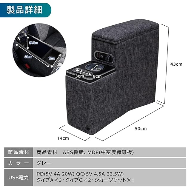 ・POINT.3 「夜も快適なLEDライト 」 スイッチを押すだけで簡単に点灯いたします。 車内の暗いシーンでもして荷物の取り出しが可能です。 ・POINT.4 「充電設備の完備 」 上面プレートにはタイプA、タイプC、シガーソケットを1つずつ配備。 背部にはタイプAを2つ、タイプCを1つ配備。
