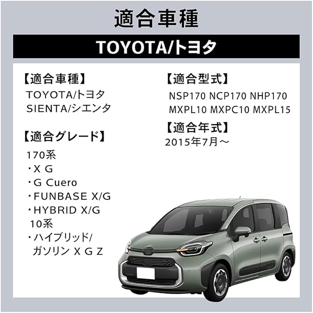 [適合車種] SIENTA/シエンタ [適合型式] ・MXPC10G MXPL10G MXPL15G [適合グレード] ・5人乗り 7人乗り ・X G Z ・ハイブリッド X G Z ・シガーソケットのコードの長さ:約1.2m 注意)ガソリン車・ハイブリッド車対応 注意)出力定格を超えて使用しないでください。ショート・火傷・故障の原因になります。 (PD:20W QC:22.5W ソケット:120W) 注意)ヒューズは5Aのものを使用しております。出力定格を超えた場合は通電が遮断されます。
