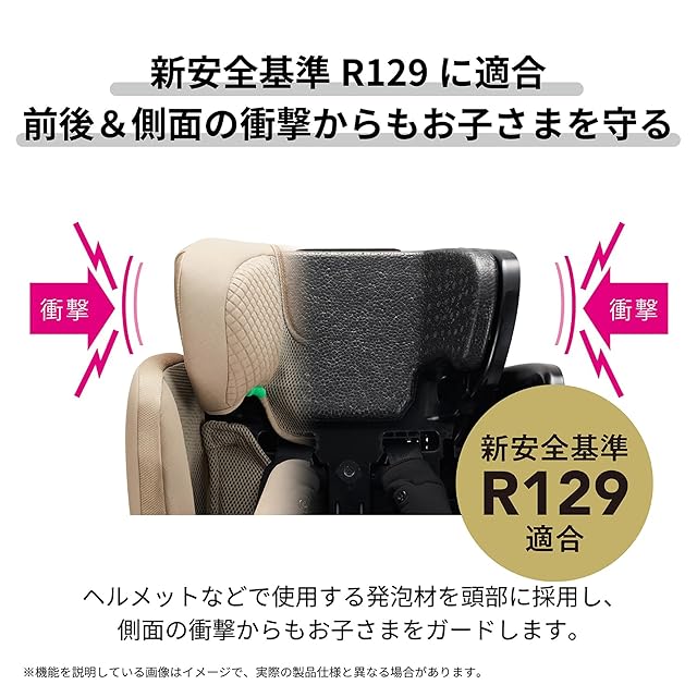 ・UN(ECE)R129/03 適合品 【車への取付方法】 チャイルドシートモード:ISOFIX取付専用 ジュニアシートモード:ISOFIX取付/シートベルト取付兼用 (メーカーHPの適合情報を必ずご確認下さい) 【使用条件】 チャイルドシートモードで使用する場合は、以下3点の条件を必ずご確認下さい。 ・身長:76cm以上-105cm以下 ・月齢:15ヶ月を超えてから ・体重:20kg以下 ジュニアシートモードで使用する場合は、以下の条件を必ずご確認下さい。 ・身長:100以上cm-135cm以下 ・本品の使用条件に適したシートモードを選択してご使用ください。 ・年齢の目安:1才頃-10才頃