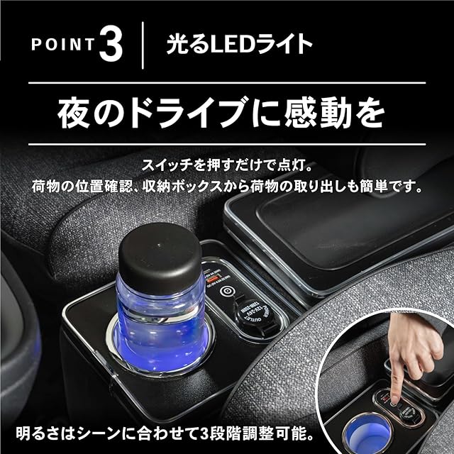 当店 大人気商品 圧倒的のLED コンソールボックス ・POINT.1 「抜群の収納力 」 大容量の収納ボックスは小物からテッシュボックスまで入ります。・POINT.2 「ジャストフィット」 設置はセンターコンソールの隙間に置くだけ。 車内に馴染むデザインで快適空間をお届けします。