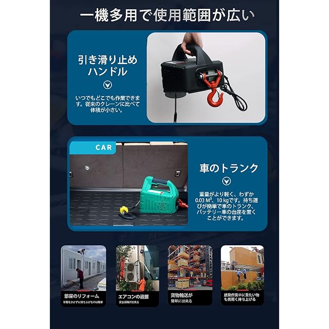 【多用途】:昇降重量物をぶら下げるのに適した電動ホイスト小型クレーン。エアコンの設置、けん引。 装飾工事、荷役、その他の場面で使用できます。