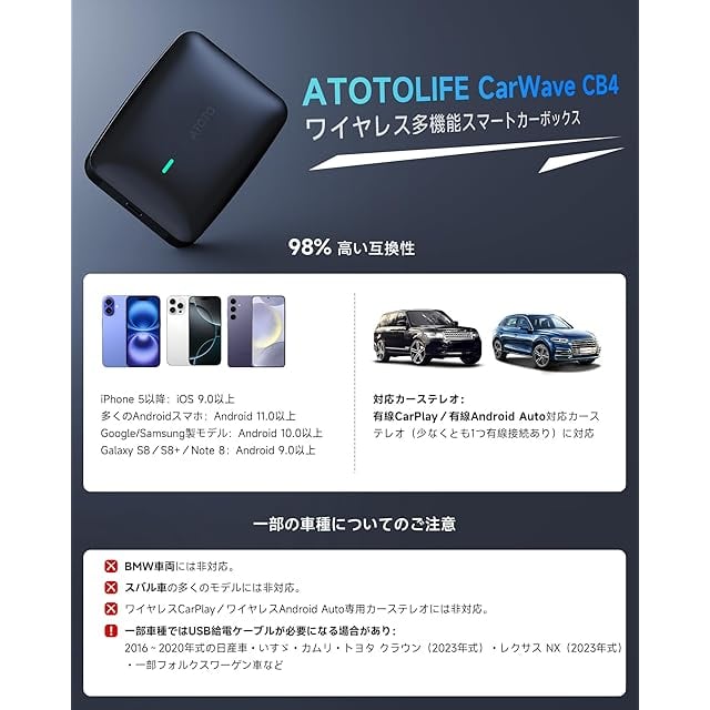 ワイヤレス接続を楽しむ:CarWave CB6(別名: ATOTOLIFE CB6C)は、有線CarPlay/Android Autoをワイヤレスに変換するMultifunction Car Smart Boxです。車載ディスプレイが有線対応のみでも、Wireless CarPlay Android AI Boxとして即座にアップグレード可能。「車でYouTube見る 方法」でお困りの方にも最適なAIボックスです