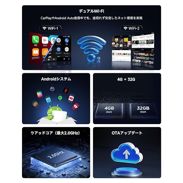 幅広い互換性:BMWシリーズを除く98%の車載ディスプレイと互換(iOS 9.0+/Android 11.0+対応)。CarPlay AI Boxとして純正/アフターマーケット両方のシステムで動作。4G LTE/Wi-Fi/Bluetooth接続可能(※ワイヤレス使用時はWi-Fi不可)Bluetoothの接続も安定してて、音楽や通話もバッチリ