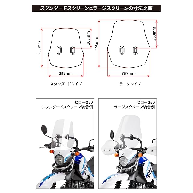 スクリーンは耐久性と強度に優れるポリカーボネート製、マウントバーは高強度アルミ合金を採用。