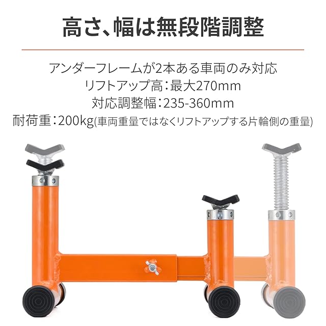 高さ調整:最大270mm / 幅調整:235-360mm / 耐荷重:200kg(リアまたはフロントのリフトアップ重量)