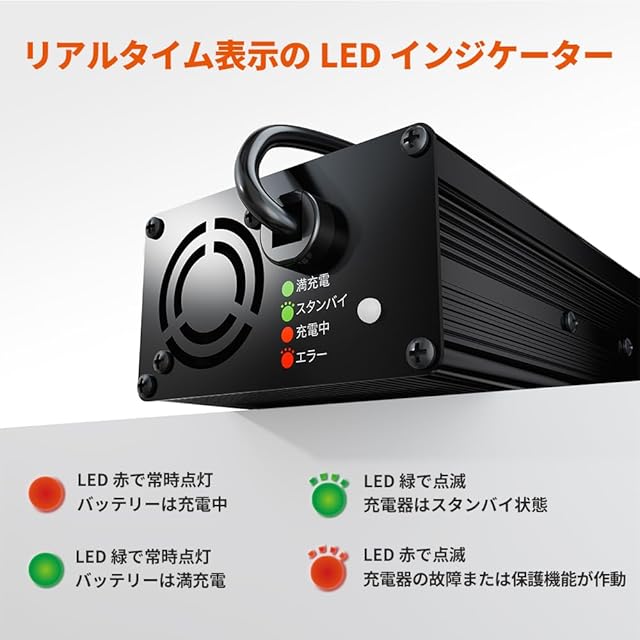 【安全性高いの充電器】弊社の58.4V 10A充電器は過電圧保護、短絡保護、過熱保護、逆極性保護が装備されています。様々な保護機能を完備することにより、想定される誤使用や異常動作時にもリチウムイオンバッテリーと充電器を最大限に保護し、安全な充電を可能としているといえます。適切に保護機能が動作する限り、火災等の重大事故は発生しないはずの、安全性の高い充電器になります。