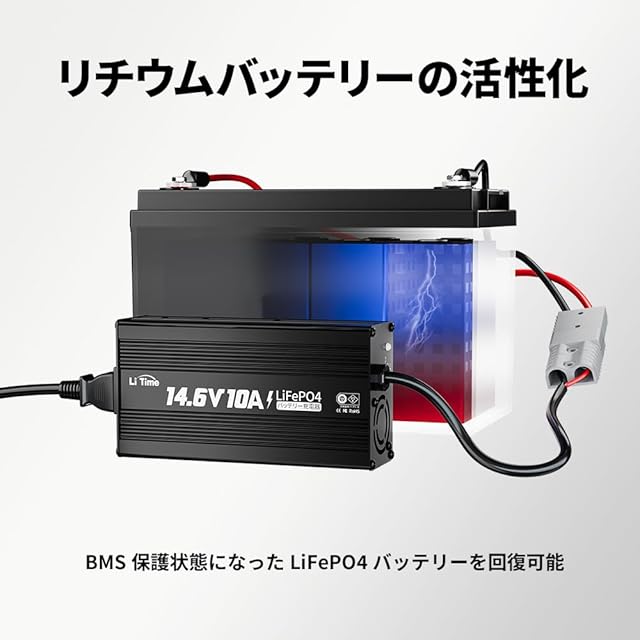 【14.6Vリチウムイオンバッテリー充電器】LiTime 14.6V 10A リチウムイオンバッテリー充電器は12V(12.8V)LiFePO4バッテリーのために設計されています。充電器は0V充電機能をサポートし、長期間使用されなかったバッテリーを復帰することができます。充電スペック:充電電圧:14.6V|充電電流:10A|定格入力電圧:100-240Vac.