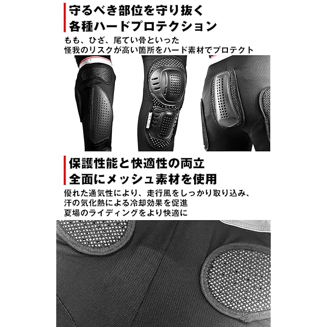 ハードプラスチックガードを尾骨・大腿部に配置し、膝にはCE規格のプロテクターを配置したプロフェッショナルモデルです