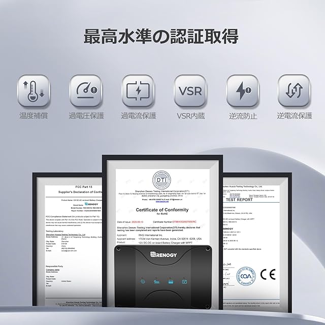 【包括的なセキュリティ】 MPPT 付き Renogy 12v DC - DC 充電器は、CE、FCC、PoH の複数の認証を取得しています。 この 50A 高品質バッテリー充電器には、バッテリー分離、過電圧保護、バッテリー温度保護、過電流保護、過熱保護、逆電流保護、ソーラー パネルとオルタネーターの逆極性保護など、複数のインテリジェントな保護機能が備わっており、充電の安全性をし、バッテリーを保護します。 複数のディープサイクルバッテリータイプと互換性があります:密閉型、AGM、ゲル、補水式、リン酸鉄リチウムイオンバッテリー