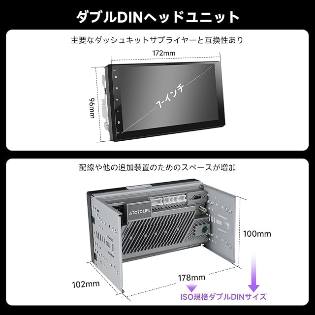 ATOTOLIFE 2DINディスプレイオーディオ、オーディオ一体型Androidナビ7インチ、ワイヤレスCarPlay/Android Auto、GPS追跡、WiFi/Bluetooth/USB、24EQ&DSP、AI会話、音声・映像再生機能、乗物用ナビゲーション装置、A5LG2B7T