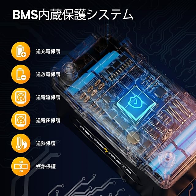 【内蔵BMS保護システム】GOLDENMATE LiFePO4バッテリーはBMSを内蔵しており、過充電、過放電、過電流、短絡を防ぎして、安全性と信頼性を向上させます。自己放電率に優れ、フル充電後最大1年間メンテナンスフリーで保管できます。 高温・低温保護機能を内蔵し、過温・過少温度での使用を防ぎ、サイクル性能と安全性を高めます。