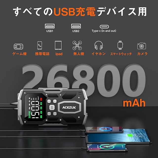 ACEZUK ジャンプスターター 一台四役 エアコンプレッサー搭載 26800mah 7000A 車用ジャンプスターター 電動空気入れ (すべてのガソリン車・8Lディーゼル車対応) 12V 車用エンジンスターター
