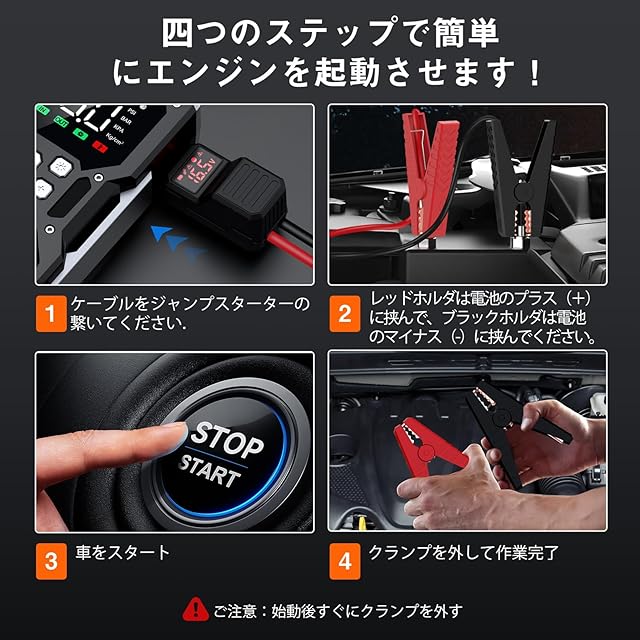 【 簡単な操作・使いやすい! 】自分の車のバッテリーの赤色端子にジャンプスターターの同じ赤ケーブルのクリップを繋ぎ、黒色端子には黒ケーブルのクリップを繋ぎ、あとはエンジンをかけるだけです。使用方法はとても簡単で誰でも扱う事ができます。⚡【スマートクランプ 】:PSE認証商品で、異常温度保護、入力電圧保護、出力電力保護が付いています。