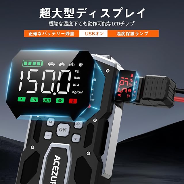 【タイヤに膨らませ】じゃんぷすたーたーはエアコンプレッサー機能搭載、一台を持っていつでもどこでも車のタイヤを空気入れます。最大150PSIで、3分間のうちにぺちゃんこのタイヤを膨らませます。空気圧はBAR,kPa,PSIの3つの単位から切り替えできます。空気圧プリセット・検知機能が持ち、設定された空気圧に達すると自動的に止まります。液晶ディスプレイ搭載して、電気量や空気圧など軽に読めます。