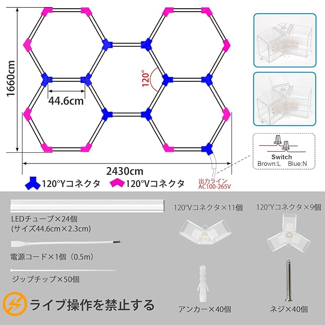 【取り付け簡単、組み合わせ自由】ガレージに適した六角形のライトです。各六角形の LED ライトチューブはコネクタで簡単に接続できます。57+12本のライトチューブを自由に組み合わせて、お好みの形状に照明設定をカスタマイズできます。