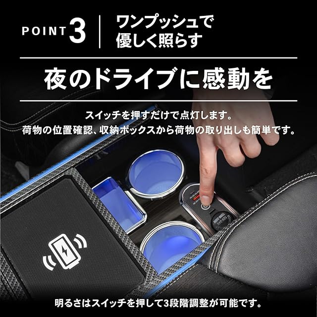 ・POINT.3 「夜のドライブに感動を」 車内のインテリアは夜になると見えにくくなります。 荷物の位置確認、コンソールからの取り出しも簡単に行えます。 スイッチを押すだけで点灯し、車内の暗さにも対応します。 ・POINT.4 「充電設備を完備」 上の面プレートにはTYPE-A、TYPE-Cを各1つずつ配備。 後部座席にはTYPE-A 2 ドリンクホルダーを配備。
