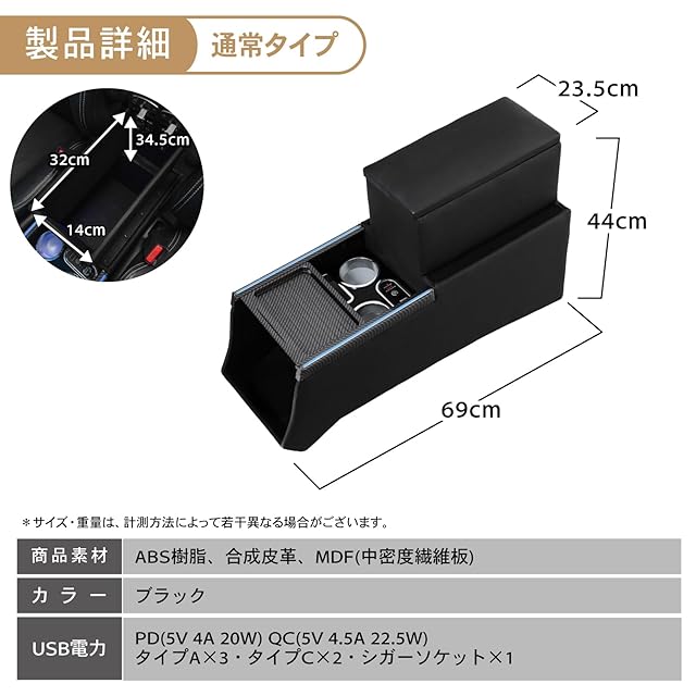 [商品詳細] 商品素材 ABS樹脂、合成皮革、MDF(中密度繊維板) 商品カラー ブラック ドリンクホルダー 2 スマホホルダー 1 USB電力 PD(5V 4A 20W) QC(5V 4.5A 22.5W) タイプA 3・タイプC 2・シガーソケット 1 注意)出力定格を超えて使用しないでください。ショート・火傷・故障の原因になります。(PD:20W QC:22.5W ソケット:120W) 注意)ヒューズは5Aのものを使用しております。出力定格を超えた場合は通電が遮断されます。梱包箱についてのお願い 商品が不良等で返送が必要な場合、元の梱包箱を使用していただくことが必須となります。 返品・交換の際にスムーズに対応するため、商品の梱包箱は捨てずに保管していただきますようお願い申し上げます。 万が一、箱がない場合は返送をお受けできない場合がございますので、ご了承ください。