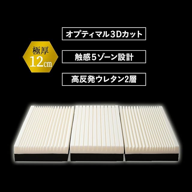 特殊3Dカットと触感5ゾーン設計で、厚み約12cmの極厚マットレス。ベ身体の各部位の重さに応じたオプティマル3Dカットにより正しい寝姿勢を保ちます。