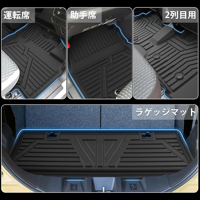 【適合車種】新型 スズキ スペーシア/スペーシアカスタム 3代目 SPACIA MK54S/MK94S 専用;年式:2023年11月~現行;セット内容:スペーシア フロアマット×3P、セカンドマット×1P,ラゲッジマット×1P(合計5PCSセット)。