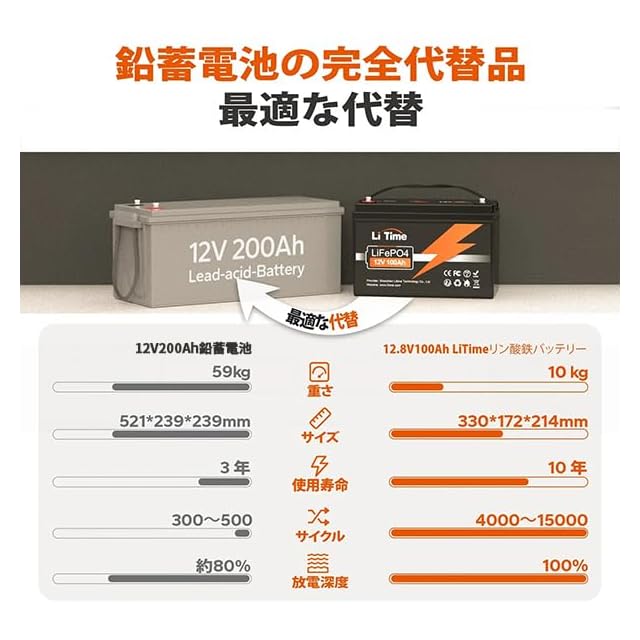 【グレードAリチウムバッテリー&10年長寿命】LiTimeリン酸鉄リチウムイオンバッテリーは、より高いエネルギー密度、より安定した性能とより大きな電力を備えた自動車用グレードのLiFePO4セルで製造されているため、品質が優れています。バッテリー内のセルに対するULテストに基づき、安全性が認められます。100%DODで4000回以上サイクル (80%DODで6000サイクル、60%DODで15000サイクル)と10 年の寿命を実現することで、SLA/AGMバッテリーの200~500サイクルと3 年の寿命よりも、はるかに優れています。
