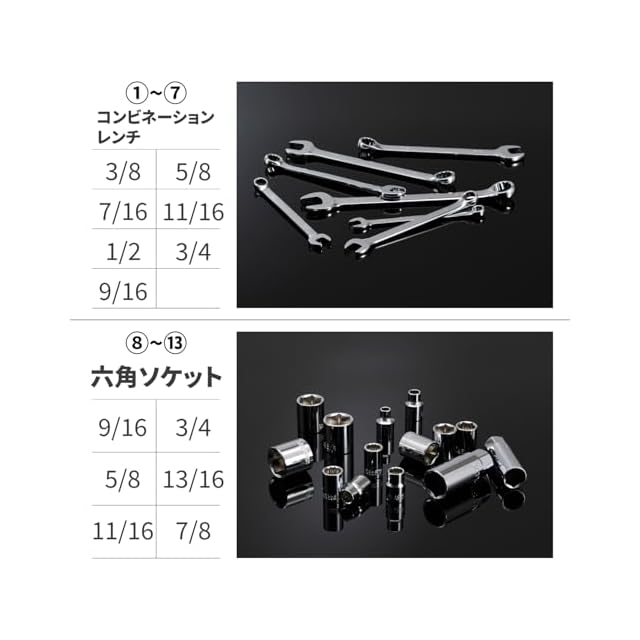 インチとミリの複合工具として設定し、どちらの規格か不明な状況でも対応可能。工具を買い足す手間・コストが不要