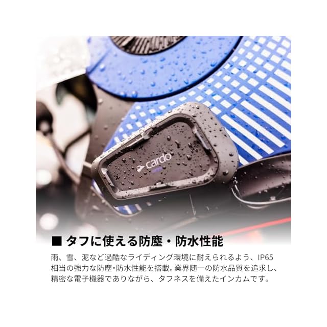 タフに使える防塵・防水性能:雨、雪、泥など過酷なライディング環境に耐えられるよう、IP65相当の強力な防塵・防水性能を搭載。精密な電子機器でありながら、タフネスを備えたインカムです。