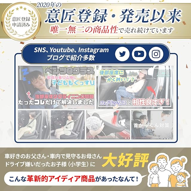 SUV、ワゴン、セダン、コンパクトカー あまりリクライニングしない【後部座席を「7度」リクライニングさせます】 後部座席で過ごすお母さん、お子様(6歳以上)を快適にするために開発されました。 重みのあるウレタンを使用し フック等を使わずに自立。 ※3D立体成形 高品質大型ウレタンフォーム使用 ●加工や改造せずに7°のリクライニングができる ●ジュニアシートやブースターが 硬い 窮屈 と不満がありそうなお子様に ●お昼寝時の首カックン対策に効果あり ●リアシートでリラックスできる構造を追求 ●サイドの張り出しが、快適な収まりを実現(運転席でもランバーサポート、厚さ調整として使用可能) ●高品位メッシュ素材で、夏場でもサラッと快適 ●背面の複雑な内部構造と適度な重さにより、多くの車種のシート形状にマッチ(背面に「すべり止め」付き) ●リクライニング角 プラス7~8度(上辺厚さ1.5㎝、底辺厚さ 約9㎝で計算) ●あるワゴン車でリアシート「27度」の場合、「34度」相当のリクライニングに ■2020年 意匠権 登録済み <注意事項> ●本製品は車に装備されているシートベルトのお子様用補助装置となり、6歳未満に使用が義務付けられているチャイルドシート(ジュニアシート含む)の代用品としてはお使いになれません。 ●「シートベルトガイド」は身長約100~140cmのお子様にご使用ください。 ●本製品は3点式シートベルトにのみ装着できます。