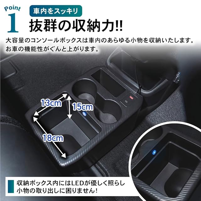 ・POINT.1 「抜群の収納力」 大容量のコンソールボックスは車内のあらゆる小物を収納いたします。 お車の機能性がぐんと上がります。 収納ボックス内にはLEDが優しく照らし小物の取り出しに困りません。 ・POINT.2 「N-BOX JF5 JF6 専用設計」 設置は簡単で工具や説明書不要です。 センターロアボックスにはめるだけでOKです。