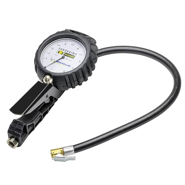 Michelin(ミシュラン) エアーゲージ ユーロダイモは、タイヤの空気圧を測定しながら空気を入れる事ができるミシュランブランドのエアーゲージです。<br />乗用車やバイクの空気圧に適したゲージ範囲です。<br /><br />[測定範囲] 70~600(KPa)<br />[最高使用空気圧力] 1.5Mpa<br />[ホース長] 0.5m<br />[本体ホース接続口サイズ] JIS 10V2(10.3×P0.907) <br />[重量] 570g<br />[インレットサイズ] 1/4<br /><br /><br />■イタリアWONDER社製。<br /><br />■大径メーターで読み取りやすく、高精度です。<br /><br />[注意] ▲パンク防止剤を使用したタイヤには使用しないでください。<br />▲別途オネジプラグ(No.15-389)をお求めください。<br />▲本品のみでは作動いたしません。<br />本品を使用するためにはエアーコンプレッサーやエアーホース等の機器が別途必要になります。<br />▲本体先端にチャック付きホースを取り付ける際は接合部の締め過ぎにご注意ください。<br />破損の原因となります。