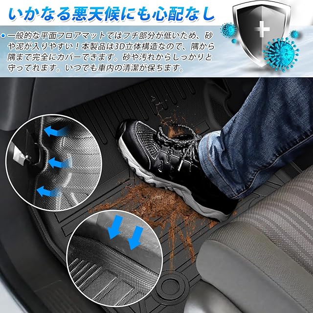 4.【3D立体構造】一般的な布製の平面フロアマットではフチ部分が低いため、砂が入りやすい。本製品は3D立体構造なので、隅から隅まで完全にカバーできます。砂や汚れからしっかりと守ってれます。いつでも車内の清潔が保ちます。