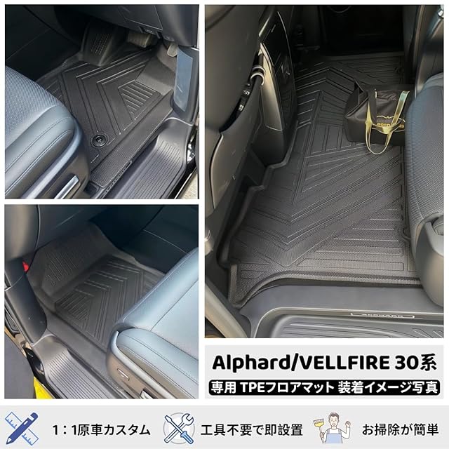 アルファード/ ヴェルファイア30系(右ハンドル車)に完全フィットする高級TPE製フロアマット。3D立体成型技術で純正車両の床形状を再現し、運転席から3列目までピタッと密着。 【5大特長】 1. 純正データ準拠の完全フィット o 30系右ハンドル車のペダル配置/シートレールに最適化設計 o 純正クリップ留め式でズレ防止(走行音ゼロ) 2. 完全防水&防汚仕様 o 高縁設計+側面アップスタンドで液体侵入ブロック o 微細凹凸テクスチャーが砂埃を自然落下(吸引掃除機対応) 3. 軍用級TPE素材 o 無毒無臭(SGS認証取得) o -30℃~80℃耐性(北海道~沖縄まで全年対応) 4. 3D立体防滑紋様 o ダイヤモンドカット溝で靴底の泥水を捕捉 5. メンテナンスフリー o 高圧洗浄可(洗車場対応) o 抗菌加工(繊維マット比べカビ発生率-90%) 【セット内容】 運転席×1/助手席×1/2列目×1/センターパネルカバー×1/トランクマット×1(5点フルセット)