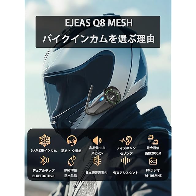 商品名:EJEAS Q8 バイク インカム イヤホン バイク用インカム 音楽ながら通話 6人同時Mesh通話 デュアルチップ Qualcomm 通信距離2000m 1~3秒ワンクリック接続 HIFI音質 多重ノイズキャンセル Bluetooth 日本語音声制御 7mm快適2-in-1スピーカー IP67防水防塵 Siri対応 他社との接続 通信自動復帰 日本語説明書 技適認証済み バイク用品