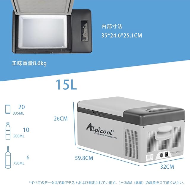 Alpicool ポータブル冷蔵庫 車載冷蔵庫 車載冷蔵冷凍庫 C15 15L 15リットル -20℃~20℃ コンプレッサー式 急速冷凍 AC100V DC12V/24V コンパクト 軽量 持ち運び便利 静音 45W 省エネ 車載家庭両用 アウトドア 車中泊 キャンプ 旅行 釣り 災害時に大活躍 PSE認証
