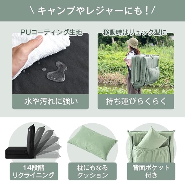 【スタッフのおすすめポイント】・シーンに合わせて選べる3つのスタイル ・極厚8cmで底付き感のない寝心地 ・14段階リクライニング ・頭まで支えるハイバック ・水や汚れに強いコーディング生地 ・リュックのように持ち運びOK ・枕になる同色クッション ・クッションをしまえる背面ポケット付き