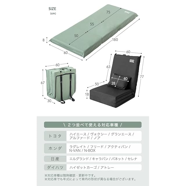 【対応車種】《マットを2枚並べて使える車種》【トヨタ】ハイエース、ヴォクシー、グランエース、アルファード、ノア 【日産】エルグランド、キャラバン、バネット、セレナ 【ホンダ】ラグレイト、フリード、アクティバン【ダイハツ】ハイゼットカーゴ、アトレー ※対応車種は随時確認・更新中です。 ※車中泊用にご購入いただく場合は、ご注文前に必ず車内幅が120cm以上あるかご確認いただきますようお願いいたします。 ※対応車でも年式によって車内の形状が異なる場合がございます。