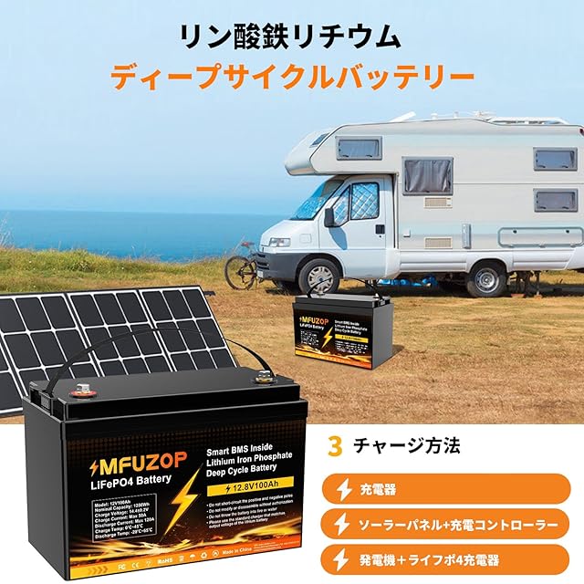 【幅広い用途】MFUZOP 12V100Ah LiFePO4 ディープサイクルバッテリーは、大電流に対する強い耐性、高い充電効率、安定した性能を備えています。 複数の家電製品を同時に使用できます。大容量であるため、太陽光発電システム、RV、船舶、屋外キャンプ、オフグリッド家庭用エネルギー貯蔵、その他のディープサイクルアプリケーションで広く使用されています。