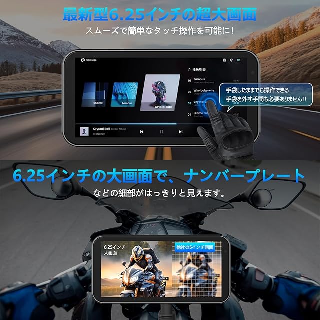 【6.25インチの大画面&多彩な表示モード&静電容量式スクリ-ン】2024年11月新登場のVANBAR BR01バイクドライブレコーダーは、6.25インチのタッチパネル液晶を搭載しています。従来モデルに比べて画面が大きく、視認性が向上しました。タッチスクリーンは非常に高感度で、手袋をしていても快適に操作できます。ナビゲーション画面、音楽再生画面、録画画面など、用途に応じた画面表示が可能です。さらに、ナビゲーションと音楽再生を同時に表示する分割画面モードや、録画中に前後の映像を1画面で同時に表示する機能も搭載しています。操作はシンプルで、画面切り替えもスムーズに行えます。