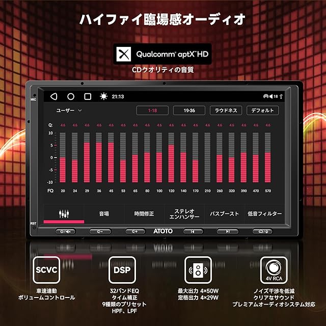 サウンド調整&高音質体験:4×49W MAX/4×29W RMSアンプとDSPを内蔵し、力強くクリアなサウンドを実現。9種類のEQモードと32バンド調整で、自分好みの音質にカスタマイズ可能。速度補正ボリューム機能で走行中も最適音量を維持し、6種類のタッチジェスチャーですばやく操作できます