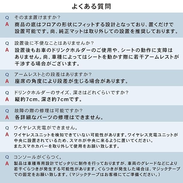 ・POINT.1 「抜群の収納力」 縦15cm 横74cm 高さ43cm大容量のアームレストボックスは車内のあらゆる小物を収納します。 ドリンクホルダー、スマホホルダーは専用でついておりますので取り出しは必要ありません。 ・POINT.2 「ジャストフィット」 設置はセンターコンソールの隙間に置くだけ。 快適な空間をすぐお客様にお届けします。