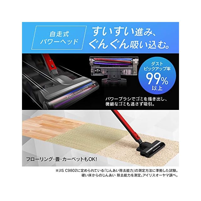【自走式パワーヘッド】 ブラシの回転力でヘッドが進む自走式パワーヘッド搭載。 優れたダストピックアップ率99%!※ 回転ブラシがカーペットや隙間の細かいゴミをかき出し 壁際のゴミも逃さず吸い込みます。 ※JIS C9802に定められている「じんあい除去能力」の測定方法に準拠した当社試験。 硬い床からのじんあい除去能力を測定。