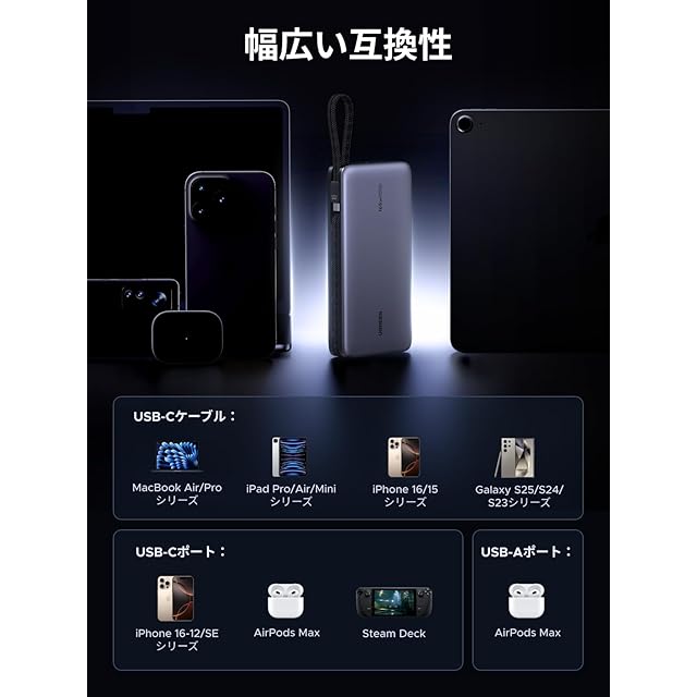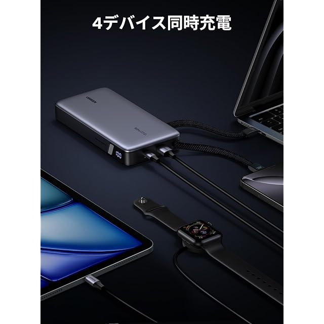 商品名:UGREEN モバイルバッテリー PD3.1対応 【165W・25000mAh】 USB-Cケーブル2本内蔵 4ポート 単ポート140W高出力・入力90W対応 パススルー機能 低電流モード搭載 240W USB-Cケーブル付 PSE技術基準適合 MacBook Windows PC iPad Pro iphone17 Galaxy Android スマートフォン ノートPC その他 PB552